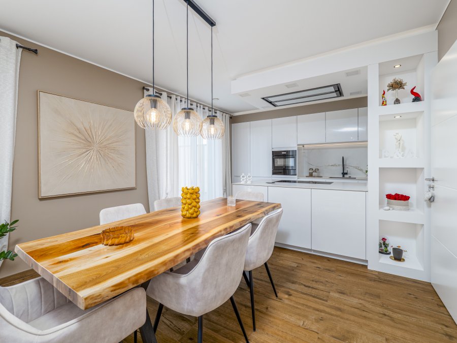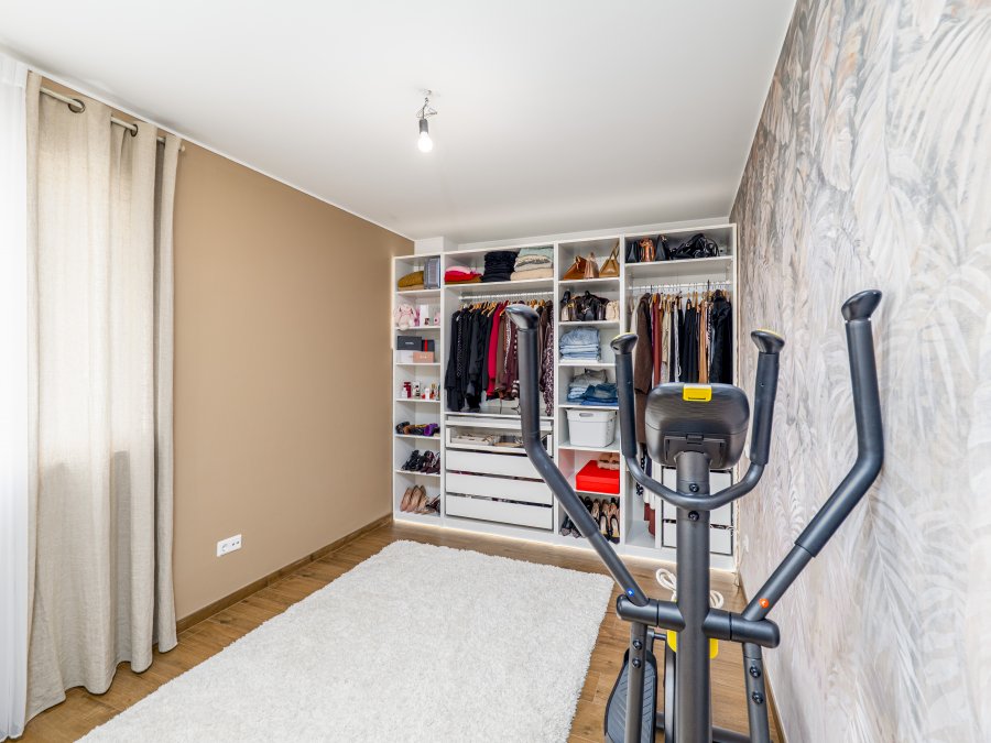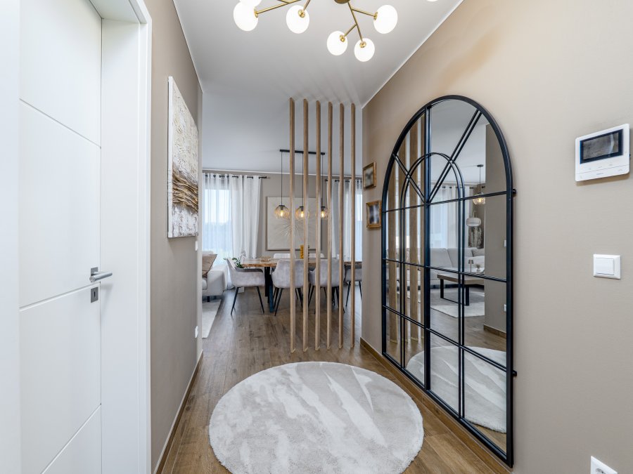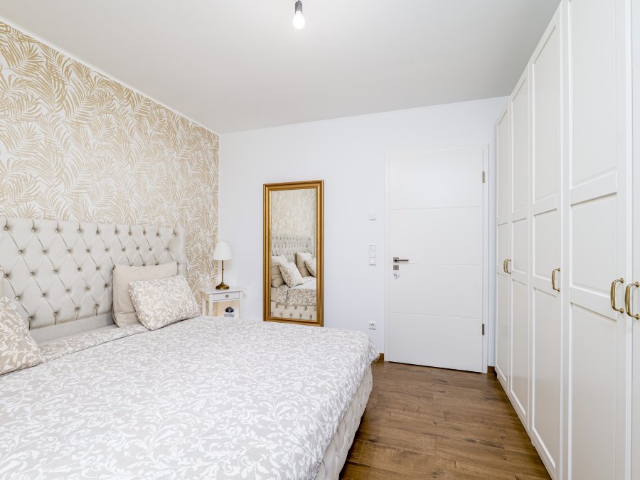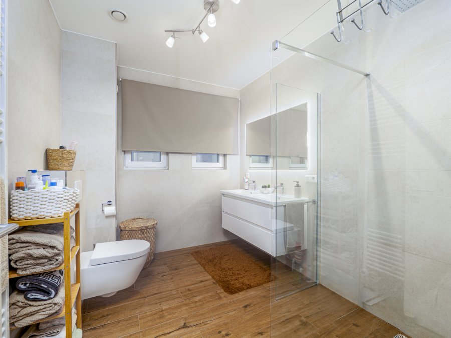 L'appartement disposé d'un chauffagé centralisé au sol en toute pièce et la choix de poser du grés en porcelaine imitation bois a été dicté par le fait que ce matériau est l'un des meilleurs en termes de conductivité thermique et de résistance dans le temps. Toute pièce, fait exception du WC, ont des fenêtres en triple vitrage avec système de volets électriques. Au sous-sol vous trouverez la buanderie commune, où chacun avec sa propre machine, le local à vélos et le local à poubelle. Dans le garage, partagé avec la résidence jumelée à côté, le bien dispose de bien 2 emplacements privés et une cave de 7 m².