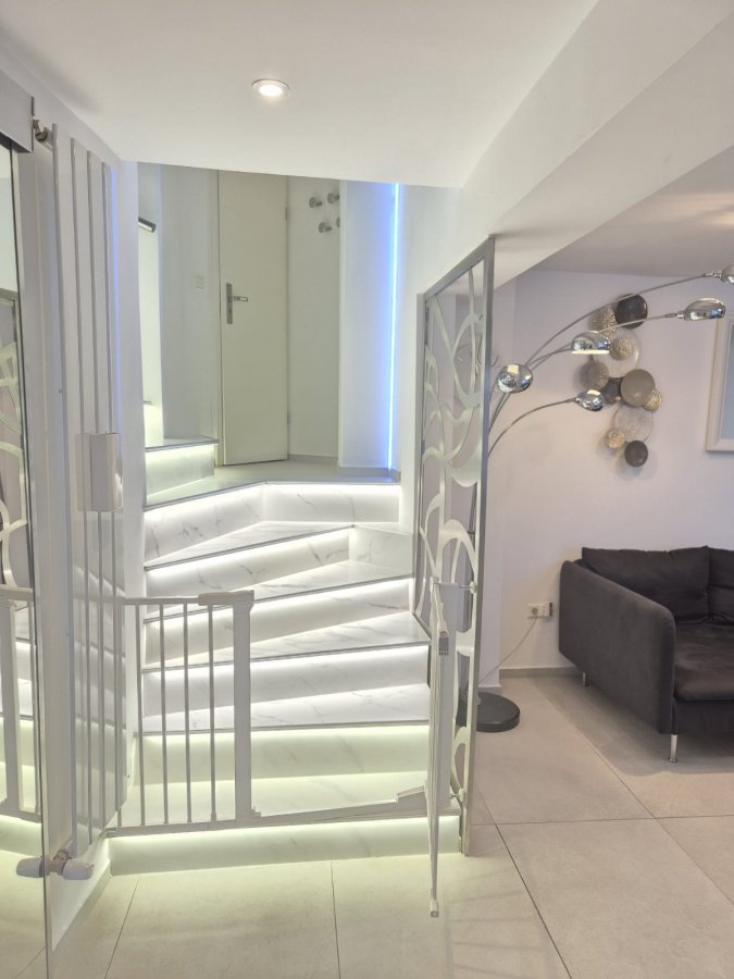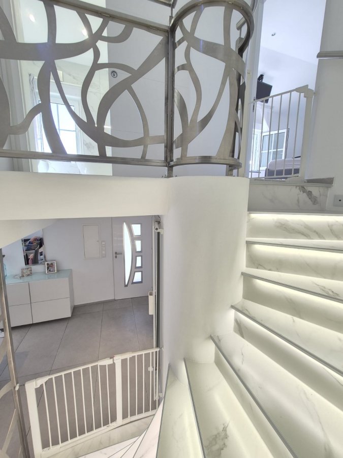 - Escalier contemporain avec finitions soignées, carrelage élégant, garde-corps en inox et éclairage LED intégré.