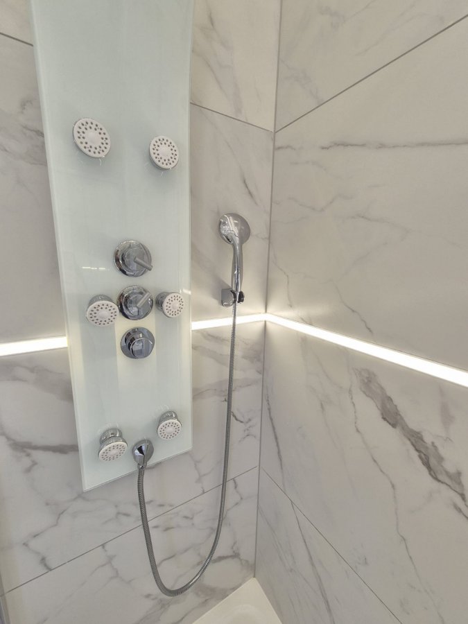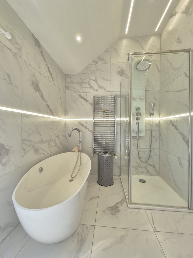 - Salle de bain design avec baignoire élégante, grande douche, bidet, fenêtre et éclairage LED moderne et WC.