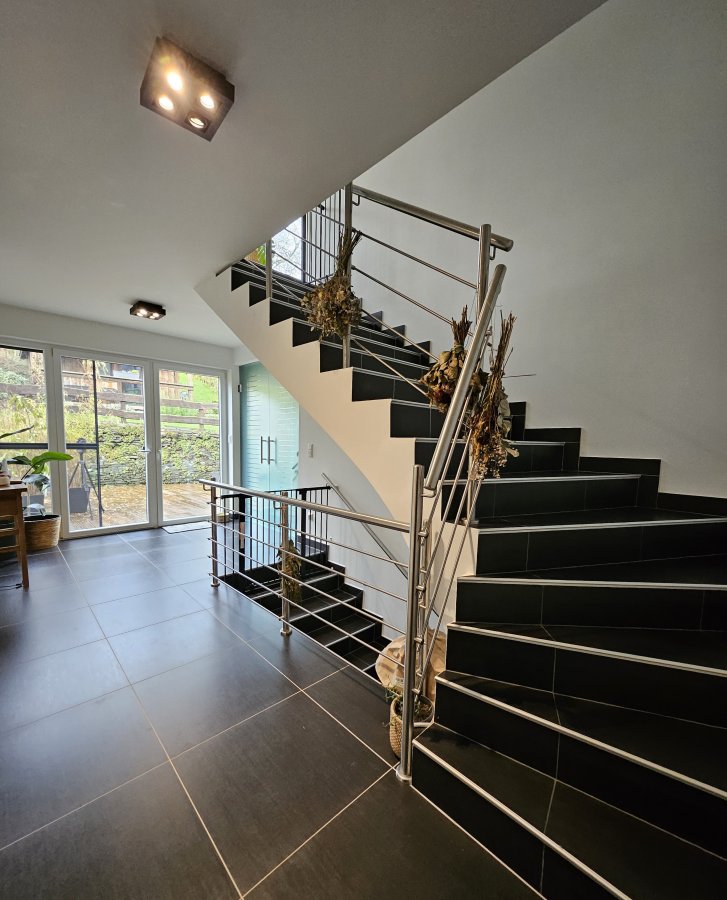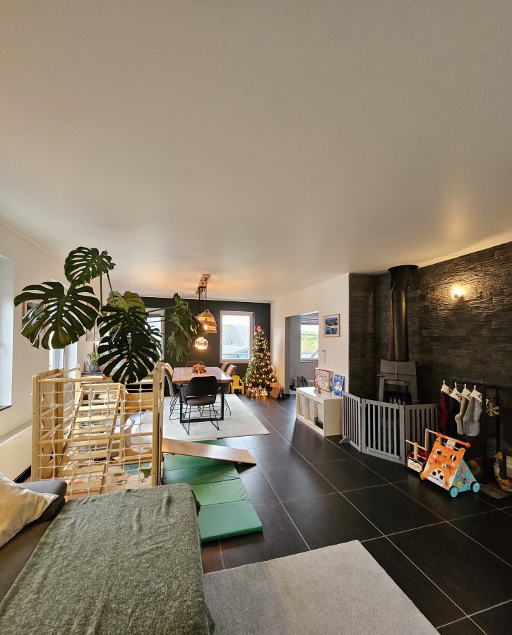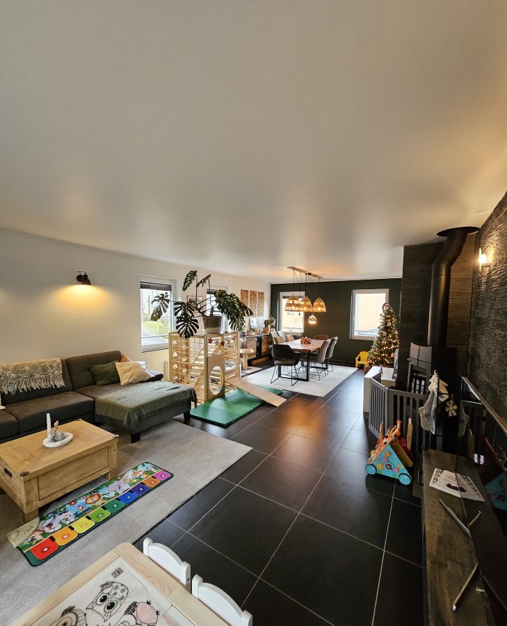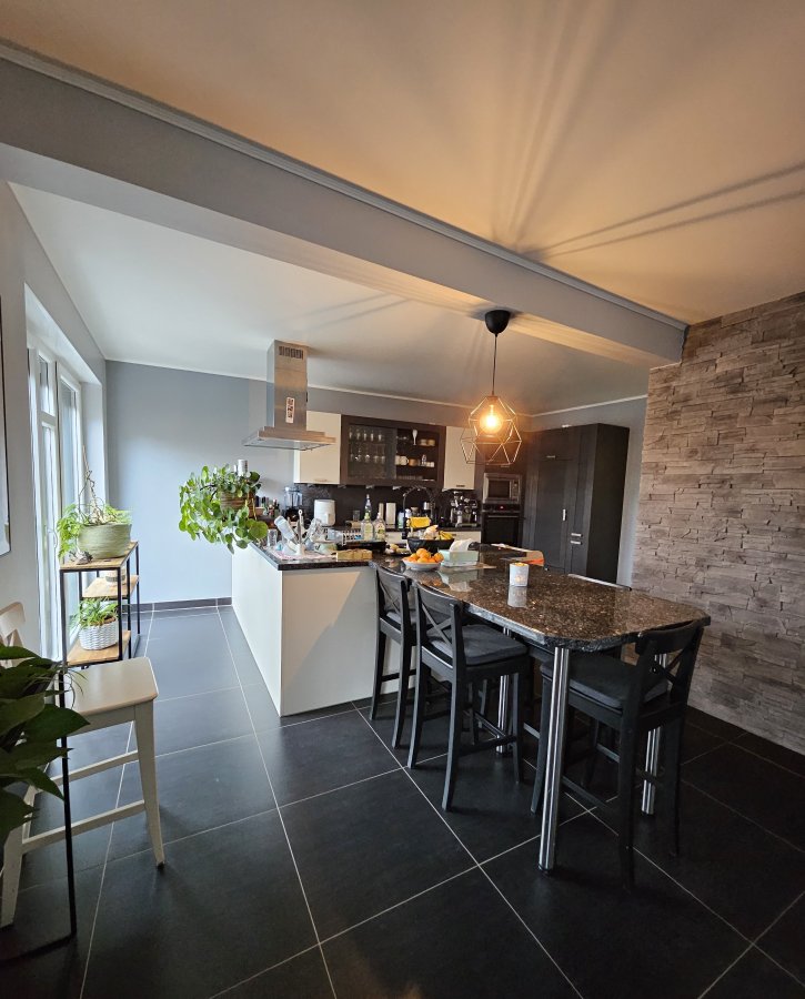 Au 1er étage vous trouverez un hall donnant accès à sa belle terrasse de 50 m² et un grand jardin, une grande pièce à vivre de 48 m² très lumineuse avec poêle à bois et donnant également accès à la terrasse, une cuisine entièrement équipée de 35 m², avec des électroménagers des meilleures marques et avec un espace de stockage, ouverte vers la pièce à vivre et un WC.
